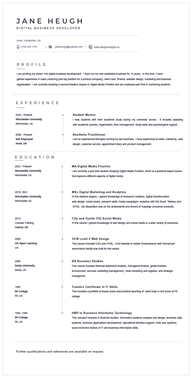 My background spans many years in the health (NHS) and aesthetic industry and not originally in digital media and business development. I have worked with many clients from all backgrounds in my work and love interacting with people. I love to evolve and want to help others on their journey. Every now and then it helps to step back and see where one is going and I realised I needed a new challenge. I decided to focus on business strategy and digital media development. I also help mentor students at university, helping them with academic and psychological support.