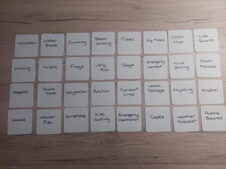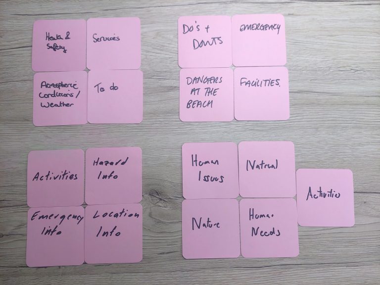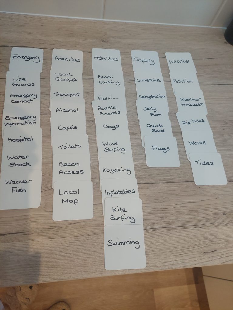 Card sorting is a UX design process that helps to eliminate information not being in the intuitive place. It sorts labels for content into larger categories (Vinney, 2022). This techniques was used to decide which categories the app should have and if they were useful. All the items that were associated with water safety at the beach were listed on cards (See image below). It was tempting to pre-categorise them but it was decided to wait, so participants could label categories themselves, which would provide further insights. Four participants were asked to arrange 32 menu items into categories (See below). Three participants arranged them into four categories and one participant arrranged them into five categories. Only activities and emergency categories were selected by two of the participants, although there were similarities such as health and safety.