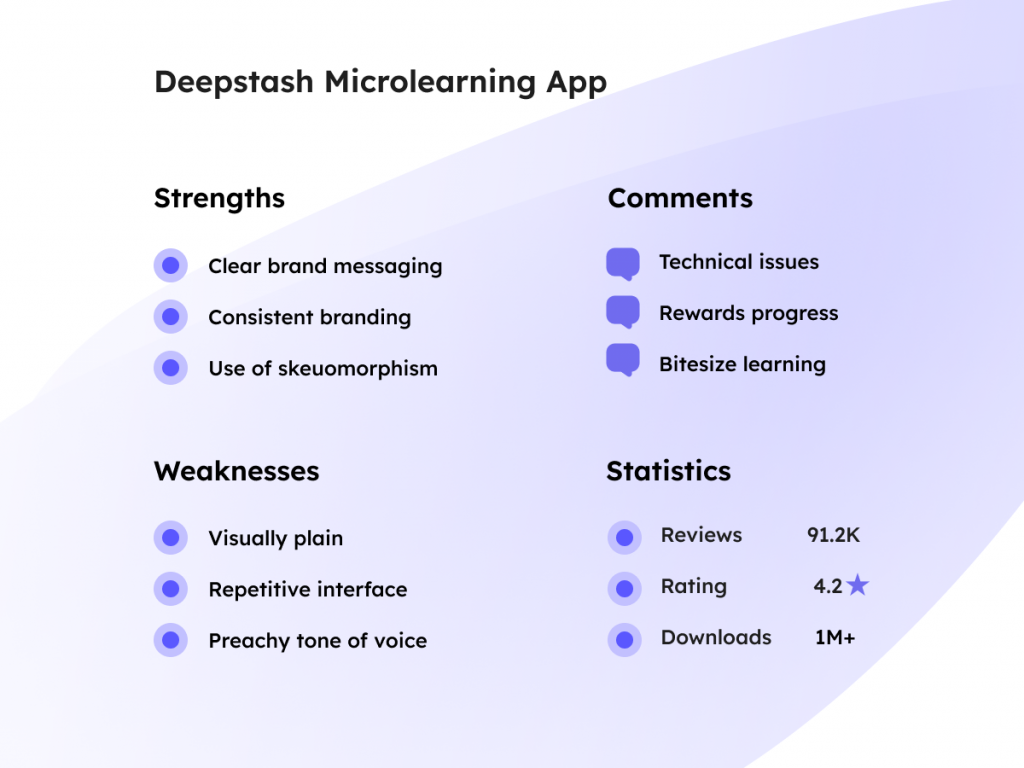 The strengths and weaknesses of both apps were similar. They both displayed consistent branding and utilised skeuomorphism, which offers a visual language that mimics real world elements. This provides the brand with a sense of familiarity and ease that is welcoming to the user (Wojciechowski, 2023) and is suitable for accessibility design as it offers affordances with visual representation (Interaction Design Foundation, 2016b). The interfaces of both apps were uninspiring and could have benefitted from some styling features. Deepstash incorporated a rewards system, which offers encouragement to the user. The tone of voice was an issue with both apps. The Deepstash app had a slightly preachy tone about doom scrolling and Go Learn hilighted keywords in their header text, which appeared very contrived. Go Learn had no full screen option, which could be an issue for those who need clarity and space. These elements were considered in constructing the architecture and styling for the app.