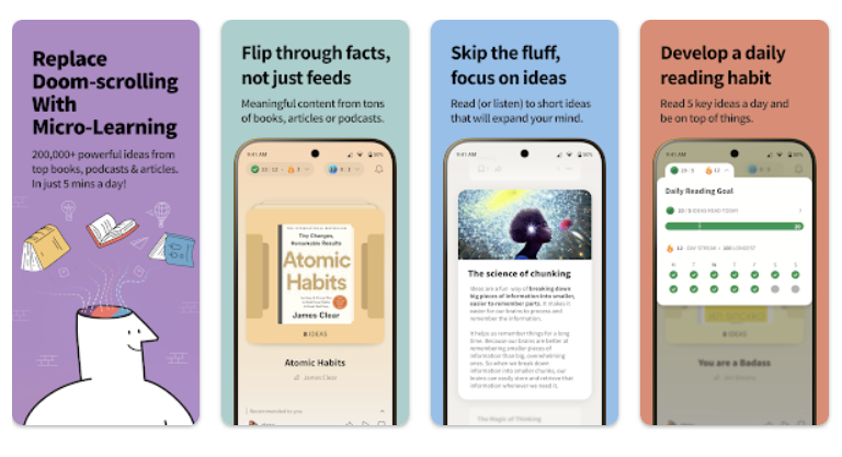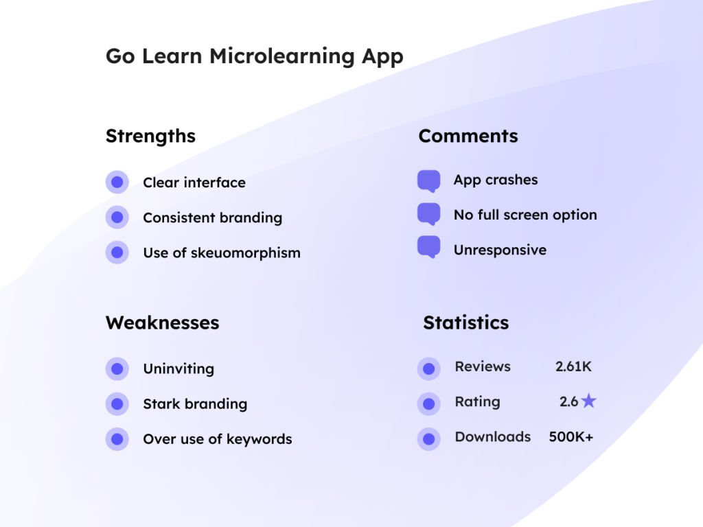 In this phase of the design process, existing microlearning applications – Deepstash (Google Play, 2024) (fig.9) and Go Learn (Google Play, 2024) (fig.10) were investigated to determine strengths and weaknesses (figs ) that could be improved upon in a new design.
