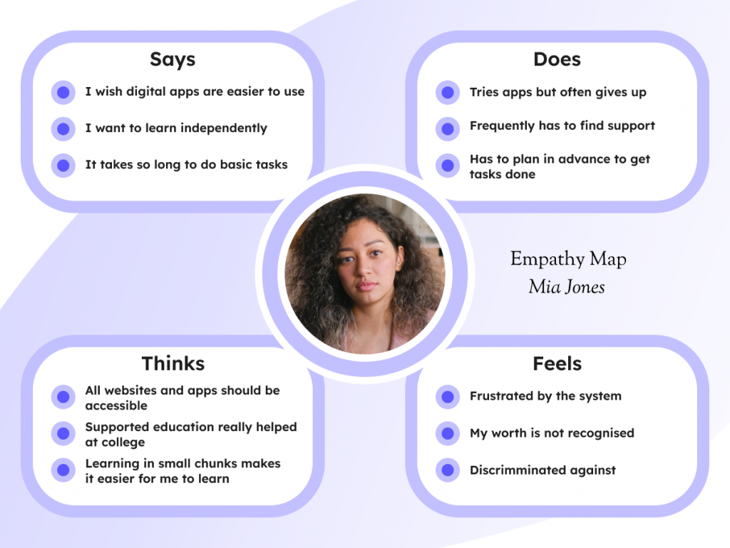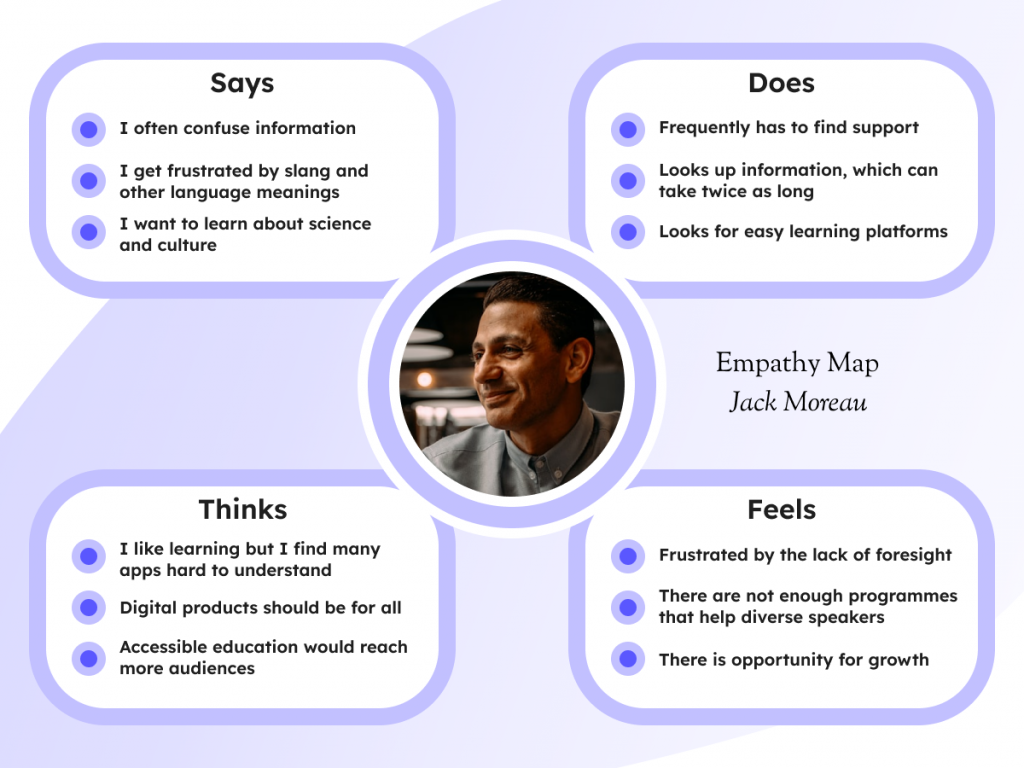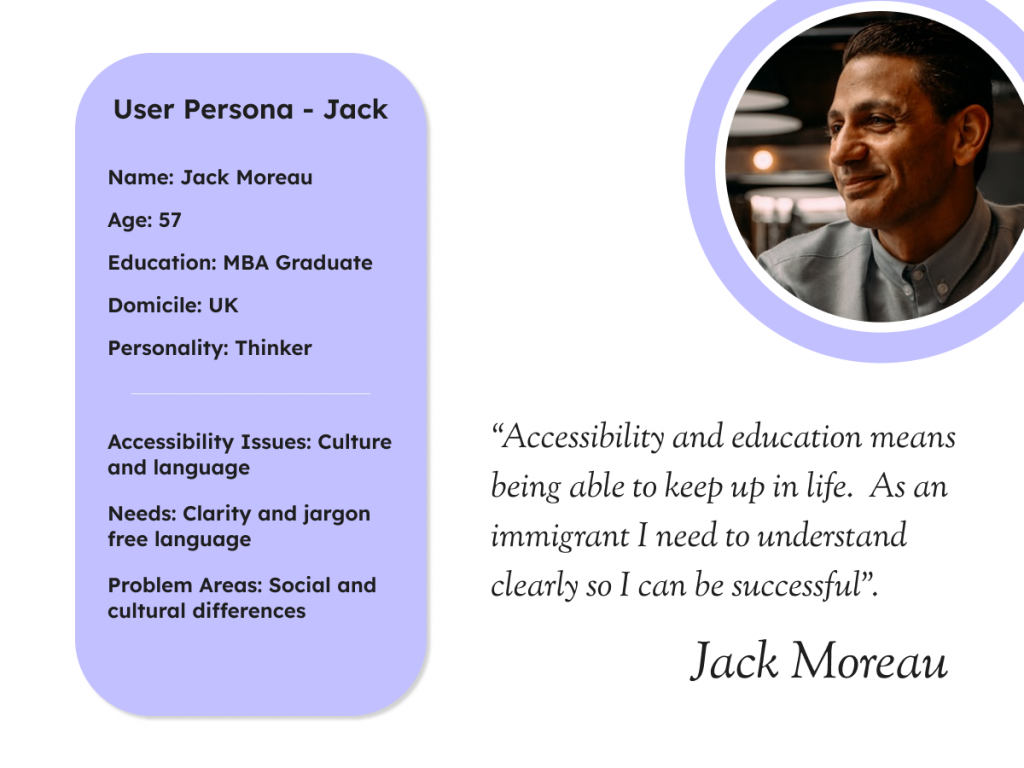 The personas are based on two digital users. The first is Mia (fig.5), a recent graduate who wants to find better opportunities at her part-time work. She experiences difficulties with Attention Deficit Hyperactive Disorder (ADHD), which means she benefits from bitesize learning that does not require long periods of concentration. The second is Jack (fig.6), a neurotypical, French immigrant who has difficulties with clarity and sometimes understanding information. He wants to be successful but worries that he might make linguistic and cultural mistakes.