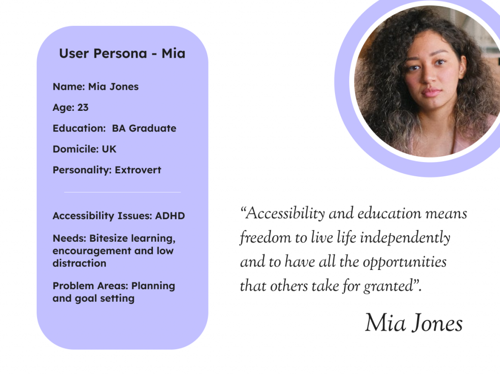 The target audience can be defined as anyone who requires accessibility and is focused into two main groups – neurodiverse and neurotypical. Although this assignment is based on general accessibility concerns, neurodiversity is a factor in accessibility. According to The Brain Charity (2024), “neurodiversity is a concept that brain difference are natural variations rather than deficits, disorders or impairments”. They estimate that at least 20% of the UK adult population has some form of neurodiversity such as Autistic Spectrum Disorder (ASC), Dyslexia and Attention Deficit Hyperactivity Disorder (ADHD). The term neurotypical is used to describe standard brain processing function. Microlearning has no specific target audience available. Microlearning has been classed as employee based learning that is used to provide specific role-based knowledge (Fortune Business Insights, 2024) and therefore would include a large and varied target audience dependent on the learning manifesto of the company. The personas are therefore based on university educated users that utilise microlearning for different reasons to achieve career success.