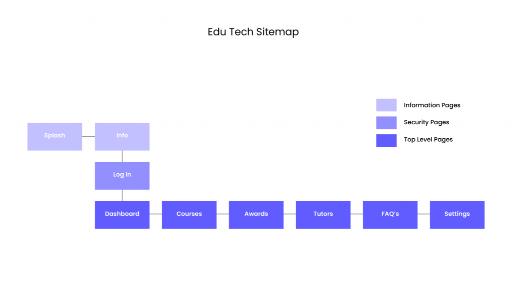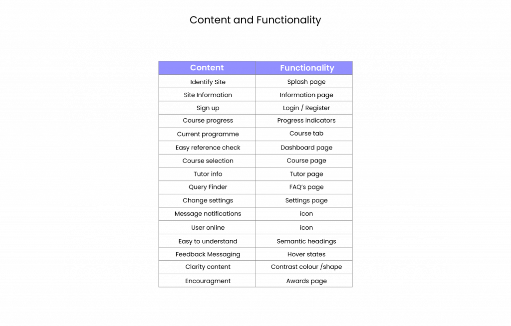 The architecture is the structure formed by the content, functionality and navigation of a design. The sitemap (fig.13) depicts the skeleton of the app displaying a flat hierarchy, which is more navigable when categories are easily identifiable (Whitenden, 2013) There are six categories, which aligns with Millers Law (Laws of UX, 2024), that proposes a maximum recall of nine categories is desirable for an average person to familiarise. The content has been arranged in a progressive order that emulates Hick’s Law (Soegaard, 2020) to minimise cognitive load. This is demonstrated in the onboarding process with the splash page introducing the site to the user, which leads to an information page and then to a sign up/log in page allowing users to understand the process in an easy format, which will become more obvious in the low fidelity wireframe. The content and functionality are listed in table fig.14, to ensure that the challenges of the personas are met such as clarity and encouragment for empathic user experience.