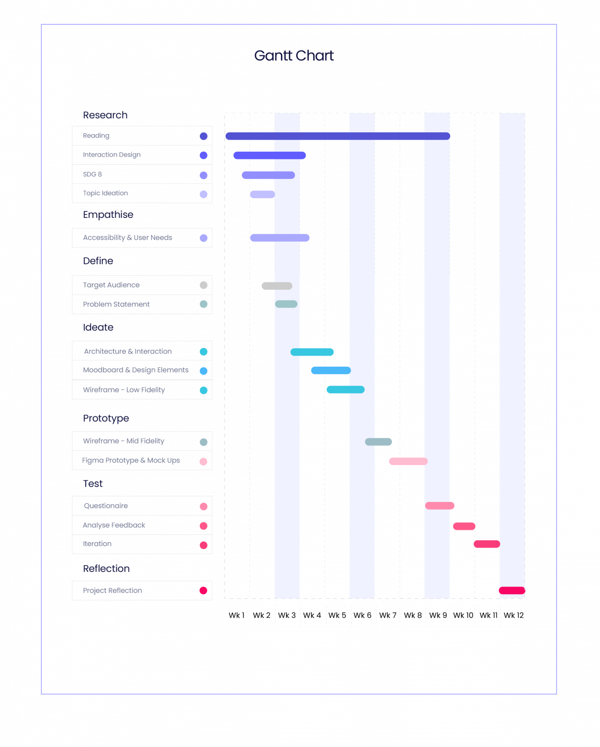 The project was managed over a 12 week period (Fig. 30). The overall style was hybrid with waterfall and sequential periods of agile management that concerned periods of design creativity.