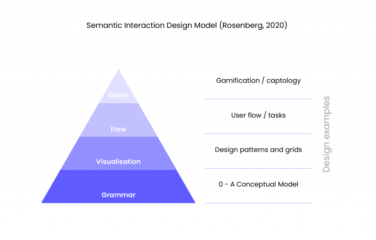 The content and functionality need to be effective and efficient avoiding any inconsistencies that may affect user experience. The Semanatic Interaction Design Model (Rosenberg, 2020) (Fig.15) considers four points of interaction relationships in semantic design – 1. Grammar – between functionality and user goals 2. Visualisation – grid layouts following recognised patterns 3. Flow – how navigation, content and actions advance tasks 4. Game – how specific actions reward user behaviour. This is pertinent especially to accessibility design as it challenges the designer to consider each step of the design process to ensure that it is understood by the user and that they are rewarded by their interaction such as button hover states, interactive cards, drop down boxes and an interactive lesson, which are demonstrated in the Figma mock up Section 5.4.3.