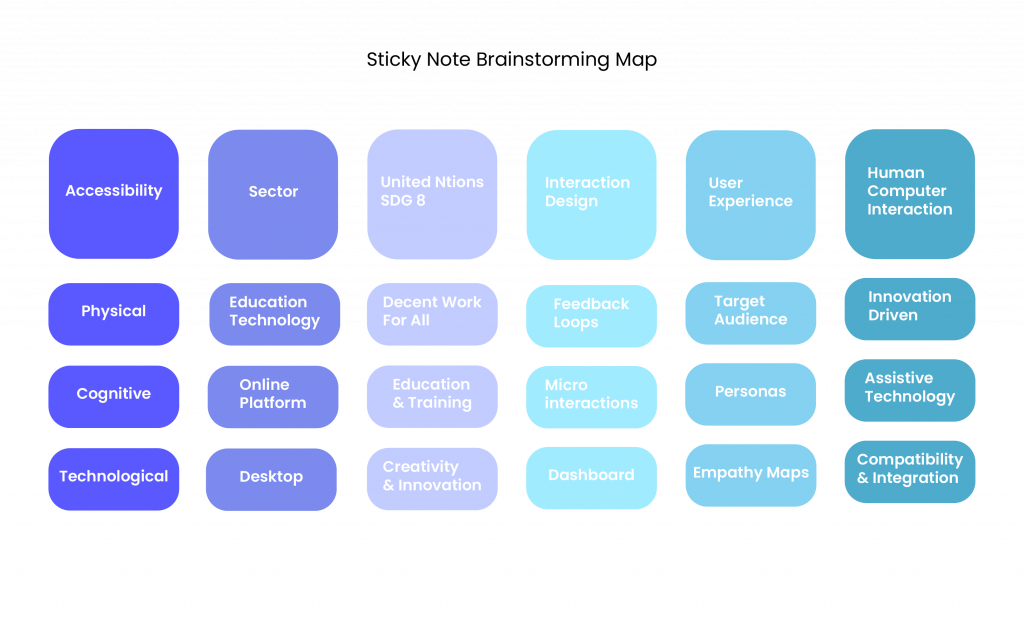 The following section investigates the background of Interaction Design (IXD) (1.1) and its role in the development of digital products for those with accessibility needs. The Sticky Note Brainstorming Map reflects the various aspects that were considered in this project and used to guide the assignment process.