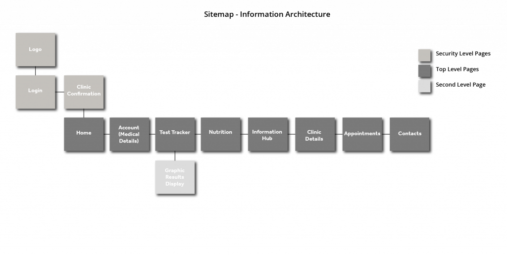 There is a focus to fulfil these needs through app functionality, that is useful to the user. In order for the UI and context to be relevant, the design process needs to consider the hierarchy of function and the hierarchy of content (Worthington, 2023). The branding, menu and navigation will be more static than the content, which is hierarchical depending on user functionality. In this scenario, the user would be assigned the app to primarily monitor blood pressure and weight, so it would be logical to have this higher up in the content hierarchy than for example an online store. A sitemap (Fig. 14) was crafted to ensure that the order of user functionality follows context and is hierarchical, even through top level pages. The logo, login and clinic confirmation are security driven to allow access to the app. The next level consists of top level pages for menu/home, medical details/account, test tracker, nutrition, information hub, clinic details, medical appointment schedule and contact details. There is a second level page, which provides graphic readouts of the test tracker, which presents them in an easy to view format.