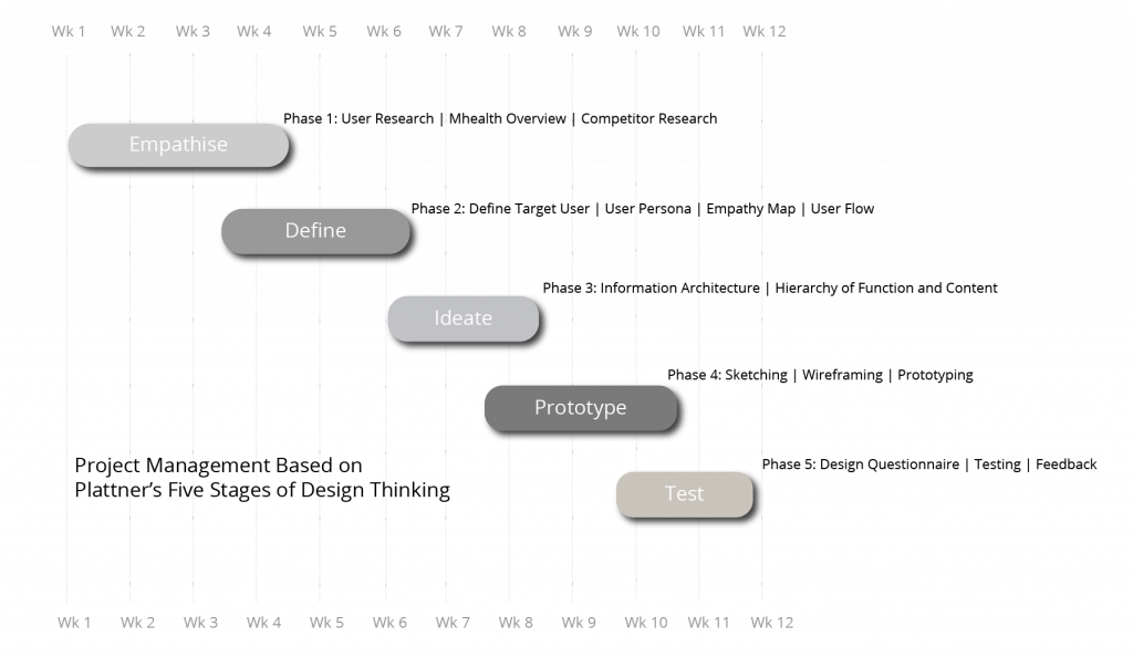 The project followed Plattner’s Five Stages of Design Thinking (Dam, 2022), which conceptualises the empathise, define, ideate, prototype and testing stages. Design thinking is iterative in nature and the project management was aligned to this format (Fig.19).
