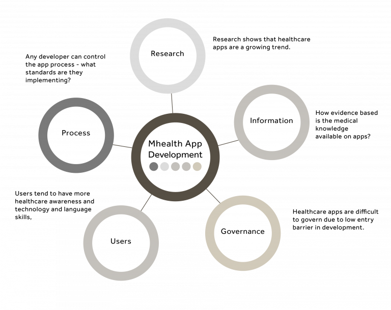 Whilst the addition of any information to pregnant women is desirable, there are concerns about the medical accuracy of mHealth apps.  Bert et al., (2016) found a lack of evidence that pregnancy apps were based on reliable medical authority congruent with Magrabi et al., (2019), who found that healthcare apps were difficult to govern. There is a low barrier to entry in the development and building of healthcare apps.  Socio-technical disparity therefore provides challenges to formalising development processes and clinical governance.  The infographic below indicates some of the issues that the development of health apps encounter.